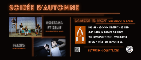 Pour cet automne l’Autruche Volante vous propose une soirée concerts le samedi 15 novembre à la salle des fêtes de Moulis ! Réservez dès maintenant surce lien !